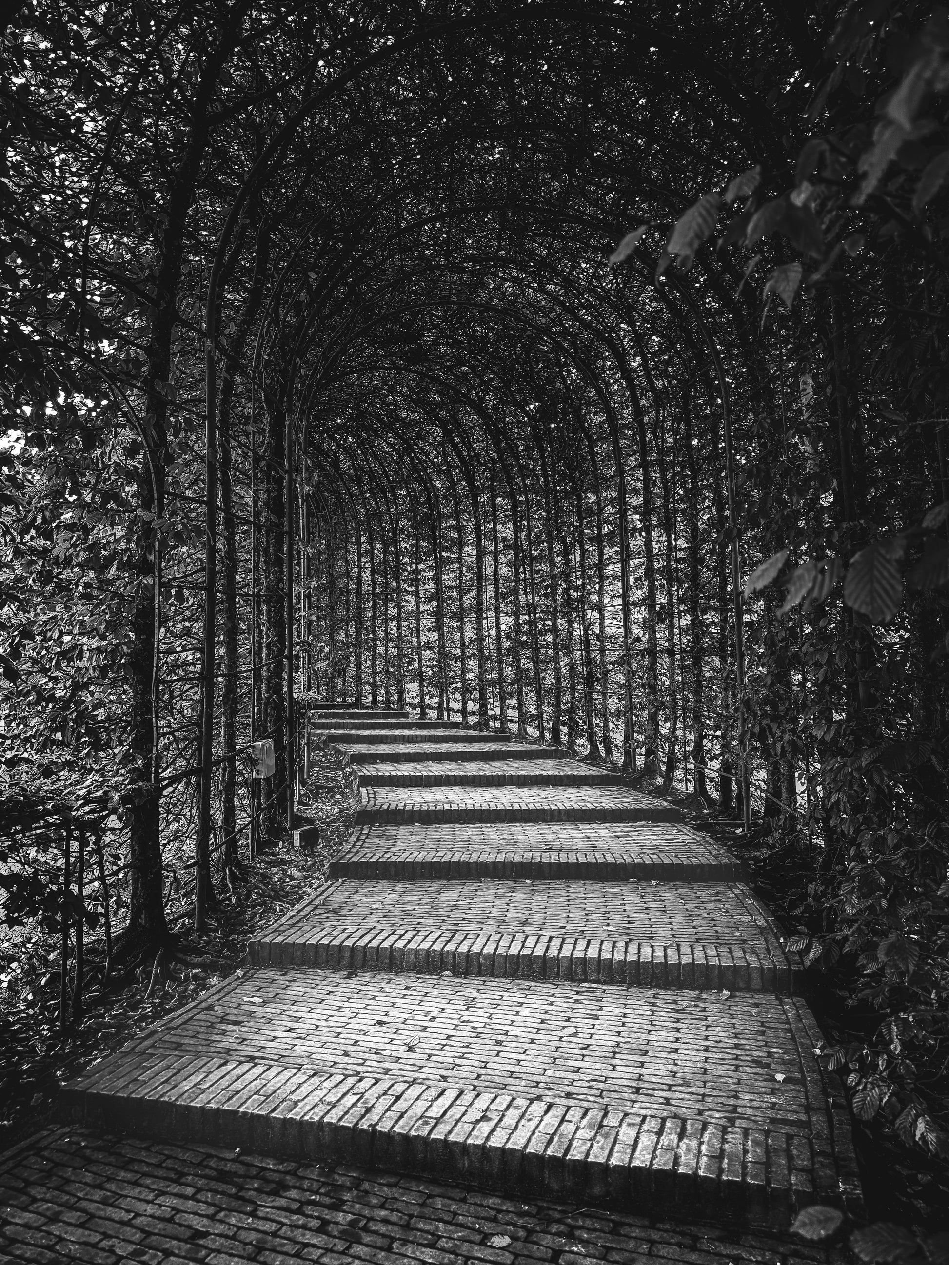 Explore the striking allure of autumn with Alnwick Garden's black and white tree tunnel. Highlighting dramatic shadows along the ascending steps, this photograph elegantly captures the essence of the season. Perfect for nature admirers, it provides a sophisticated addition to your home decor with timeless natural beauty.